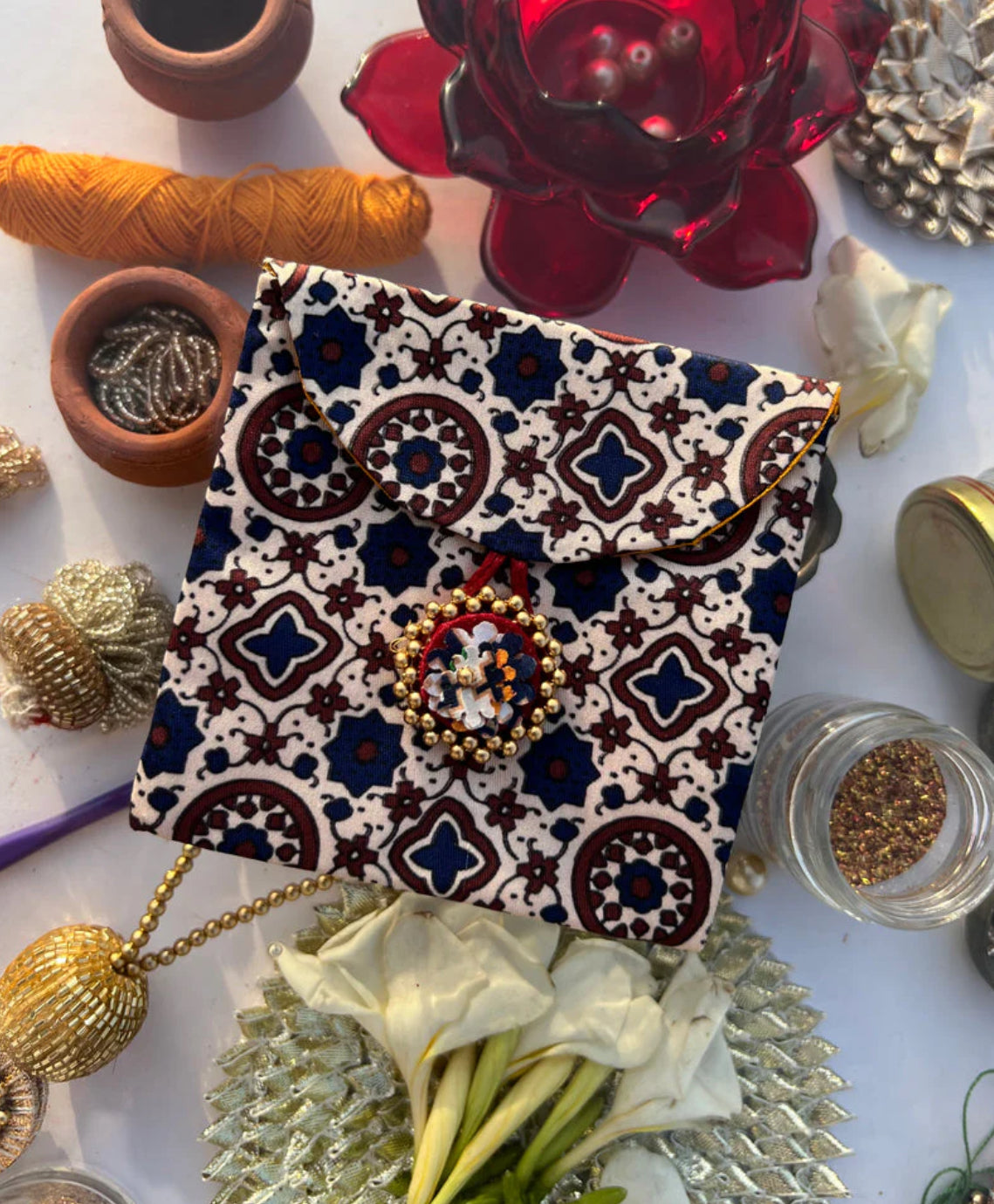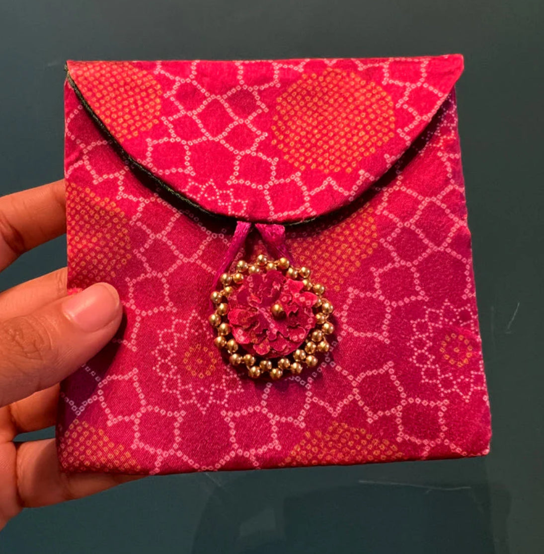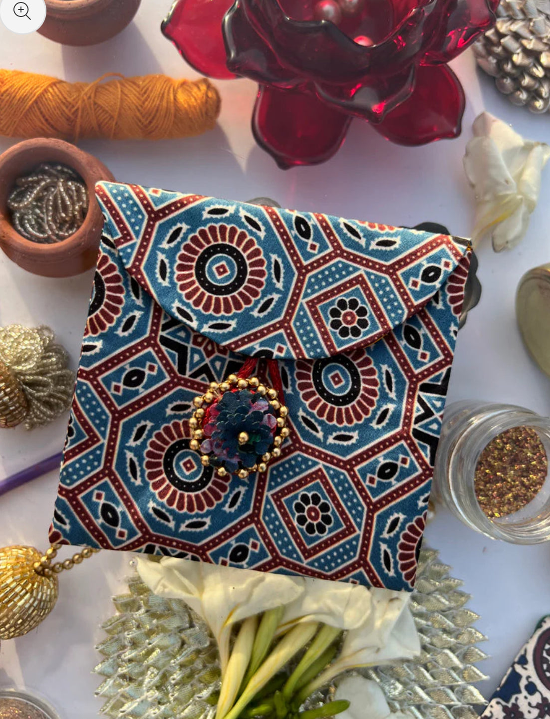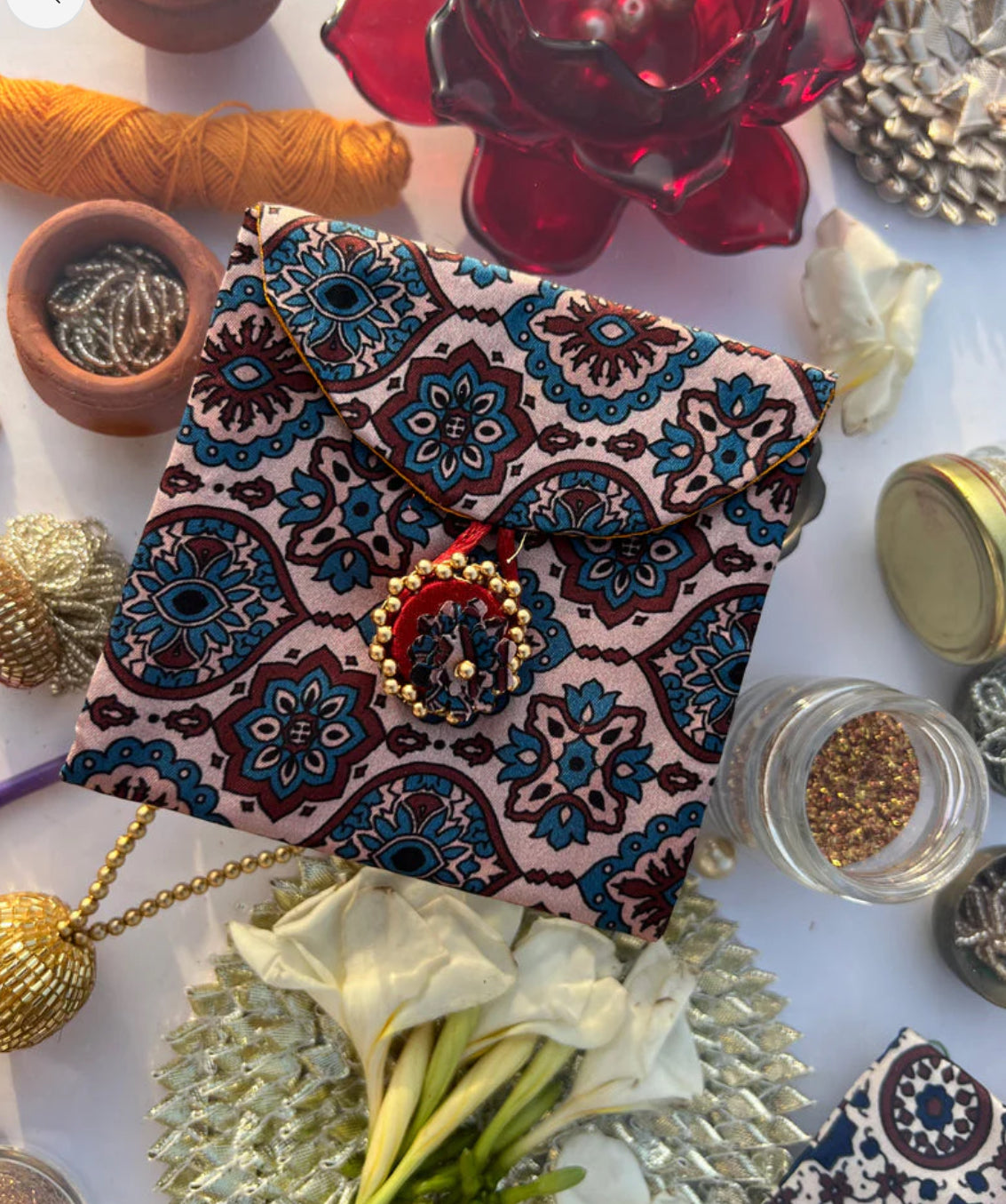 Coin Pouches Mini pouches made for rakhis and coins-shagun, rituals & celebrating traditions. The lock has a fabric flower symbolising fresh, beautiful and auspicious beginnings.