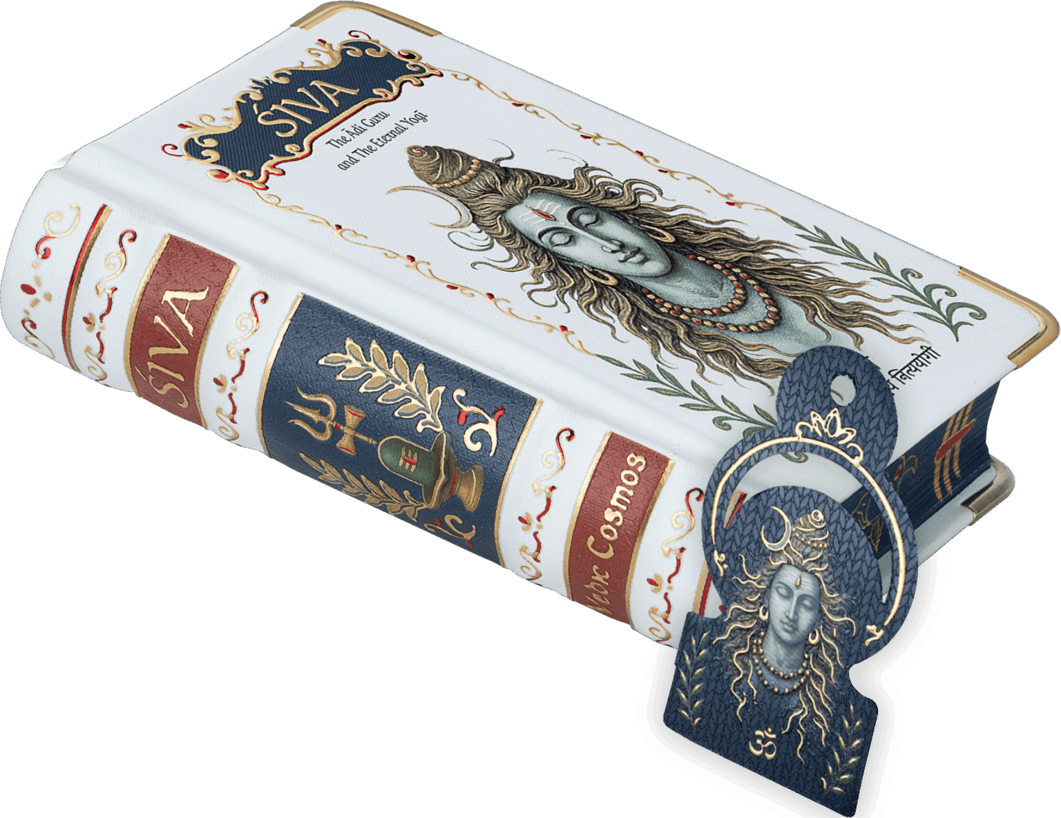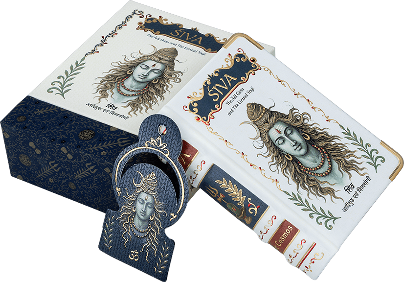 The Siva book is presented in a luxuriously crafted box with a lift-off lid, designed to reflect divine elegance and timeless artistry. The outer box features ornate floral motifs and traditional gold detailing.